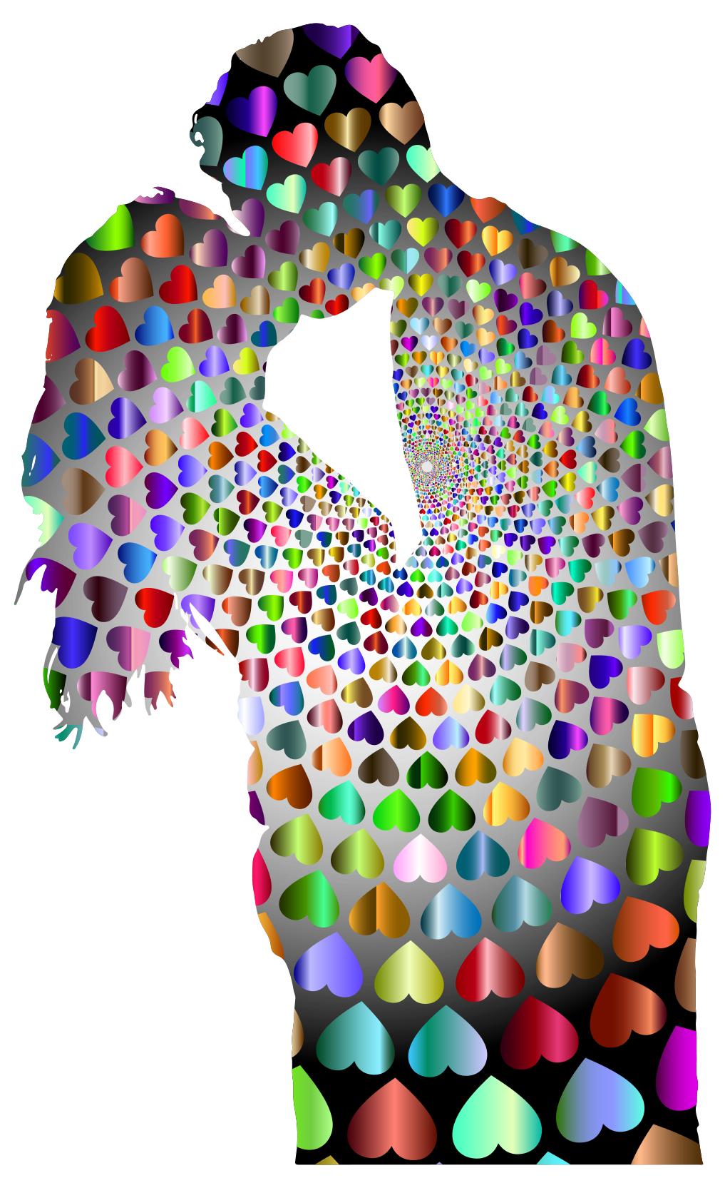 This features a man and woman standing close to each other, with their bodies made up of various colored hearts. They are embracing one another in a lovely display of affection. The hearts on the couple's bodies vary in size and color, creating an eye-catching visual effect. This unique artistic representation of love is reminiscent of a kaleidoscope, with each heart piece contributing to the overall composition.
