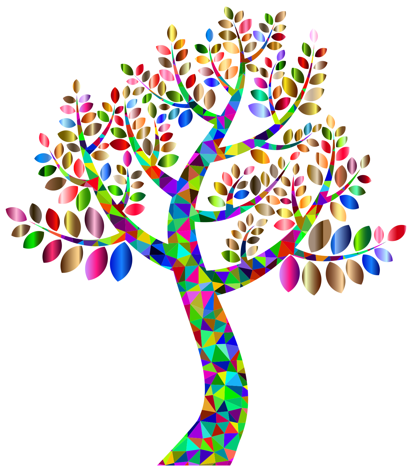 This features a vibrant tree made from abstract shapes, with the trunk being formed by various triangles in different shades of bright colors. These triangles are arranged to create an intricate and visually appealing design that resembles a tree branch. The tree is adorned with numerous leaves, each one varying in size and color, adding to its lively appearance. Overall, the image showcases a creative and artistic representation of a tree using abstract shapes and colors.