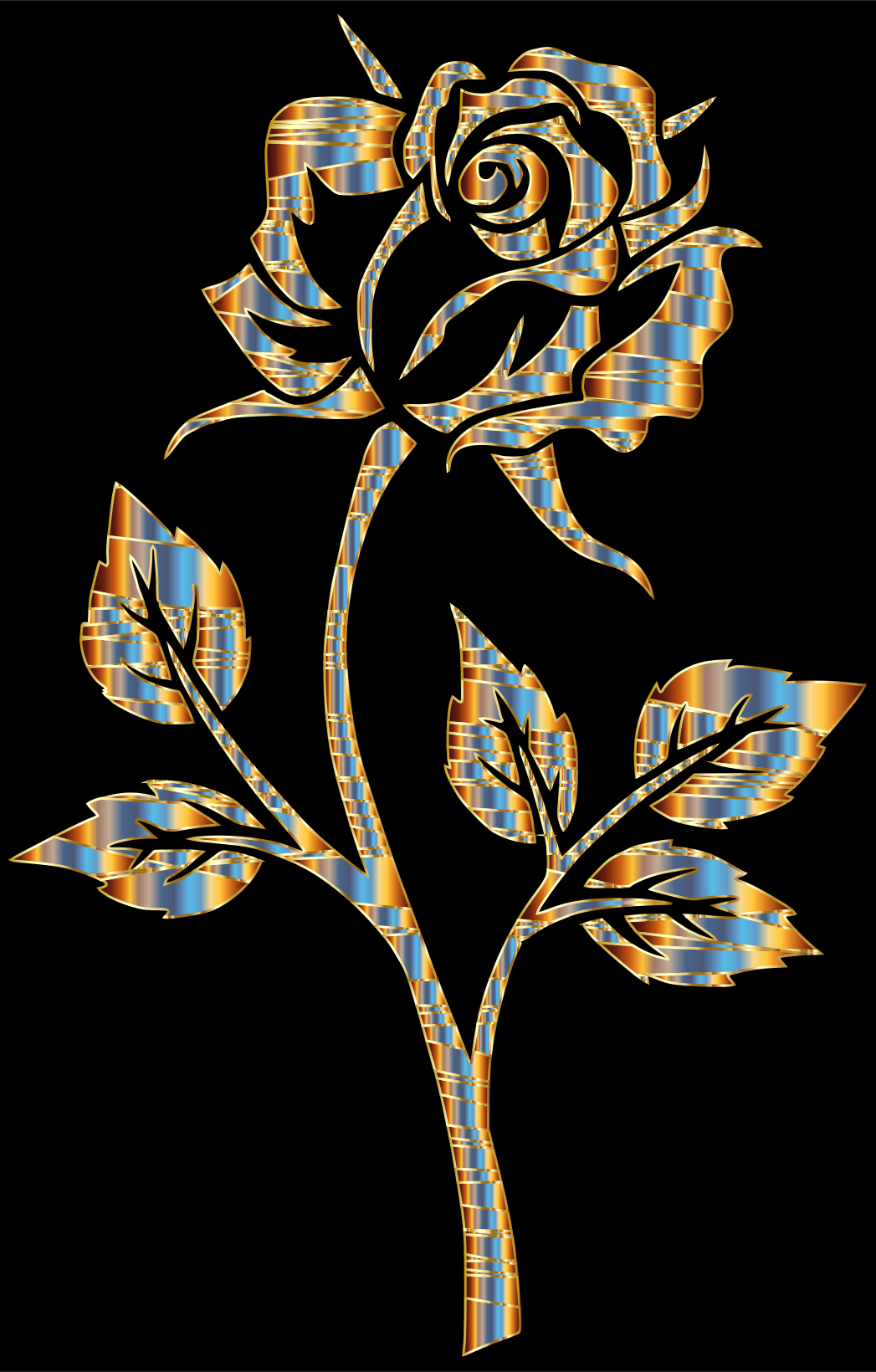 This features a black and gold rose silhouette, which is an artistic representation of the flower. The rose has a golden hue to it, giving it a unique appearance. The rose is depicted in various stages of blooming, with its petals spread out and its stem extending from the center. The overall effect is a visually striking image that captures the beauty of the rose in an unconventional manner.