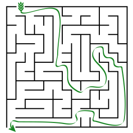 This features a maze with green pathways leading to an exit. The maze is square-shaped and has black and white squares, making it visually appealing. The green pathway stands out against the black and white background, guiding the viewer through the intricate pattern of the maze. The exit can be seen at the end of the green path, providing a sense of accomplishment for those who successfully navigate the maze.