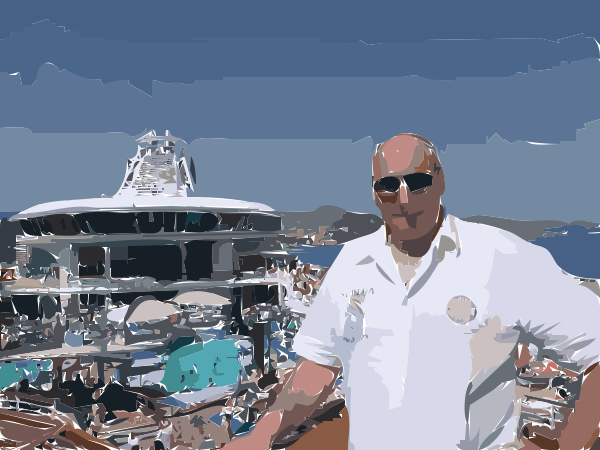 This features a man wearing sunglasses and a white shirt, standing in front of a large boat. He appears to be posing for the camera with confidence. The boat is docked at a pier, surrounded by several umbrellas providing shade for people on board or nearby. There are also multiple chairs scattered around the area, likely for passengers to relax and enjoy the view. In addition to the main subject, there are other people in the scene, some of them closer to the boat while others are further away.