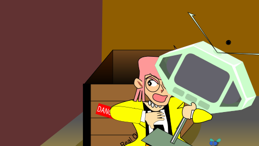 This features a man wearing a yellow jacket and holding an old television set above his head. He appears to be trying to avoid something, possibly a fly or another object. The scene is animated with 2D key-frame animation editor 9VAe, which adds a dynamic element to the image. The man's positioning and the television set he holds suggest that he might be attempting to protect himself from an incoming threat or simply playfully interacting with the TV.