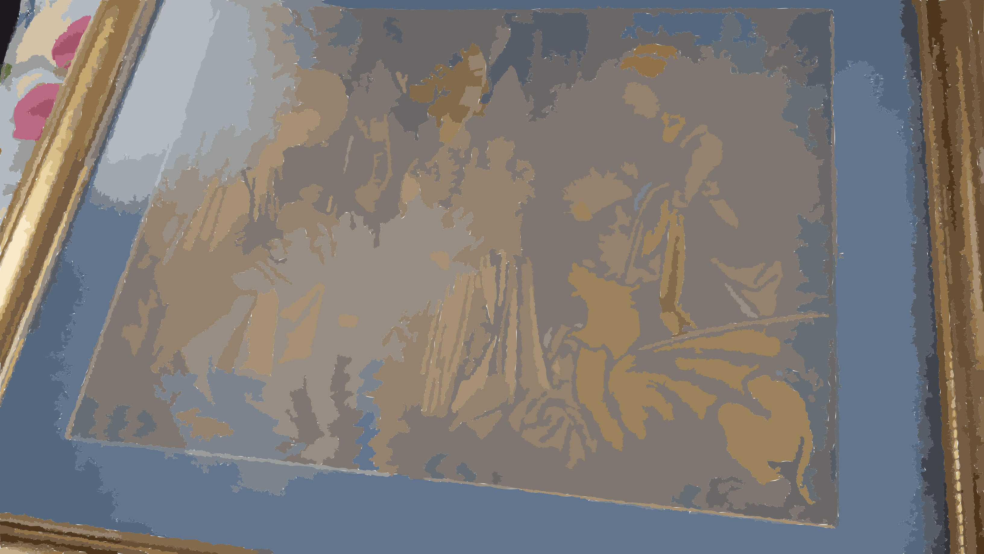 This features a framed piece of artwork, possibly an antique or a decorative item. It is placed on top of a blue table, which serves as the background for this artistic display. The frame itself has a gold color and adds to the overall elegance of the presentation. The artwork within the frame appears to be a painting or drawing, showcasing an intricate design with various elements such as people, animals, and possibly some plants. The combination of the blue table and the golden frame creates a visually appealing contrast that highlights the beauty of the art piece.