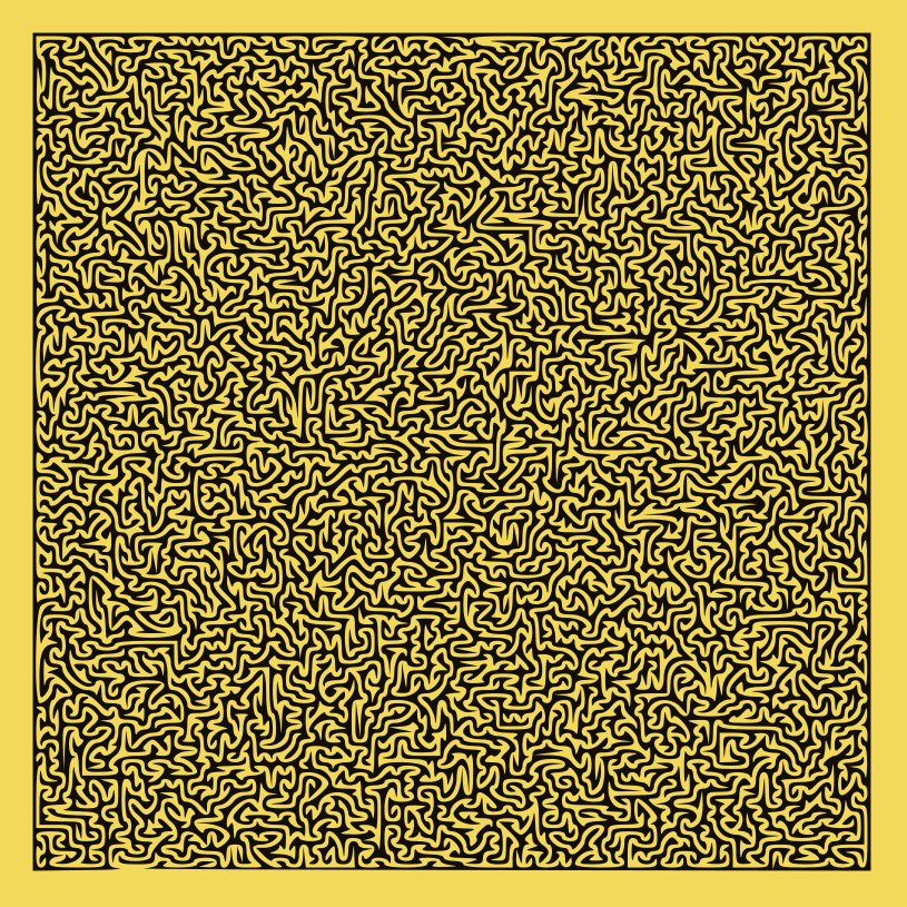 This is a close-up of an intricate, interconnected maze pattern. It appears to be a yellow and black design with many different shapes and lines creating the complex pattern. The maze seems to have no discernible entry point or exit, making it reminiscent of the Samsara Maze from Buddhist mythology. However, unlike the Samsara Maze, this one has an exit, which is located near the lower left corner of the image. The maze's design resembles a puzzle, with many different paths converging in various directions. The player must navigate through the maze to find the correct path that leads out of Samsara and into Nirvana. This can be achieved by trying different routes and remembering any blind alleys encountered along the way. It is important to note that there are multiple solutions to this puzzle, as each individual's starting point will determine their unique path through the maze.