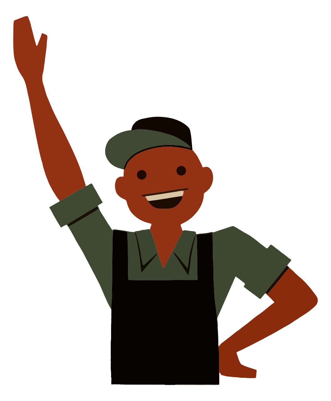 This features a cartoon man wearing an overalls and a hat, giving the impression of a construction worker. He is smiling and has his arm raised in the air, possibly waving or gesturing towards something. His attire includes suspenders, which adds to the overall appearance of a hardworking individual. The man's facial expression conveys a sense of happiness and friendliness, making him appear approachable and welcoming.