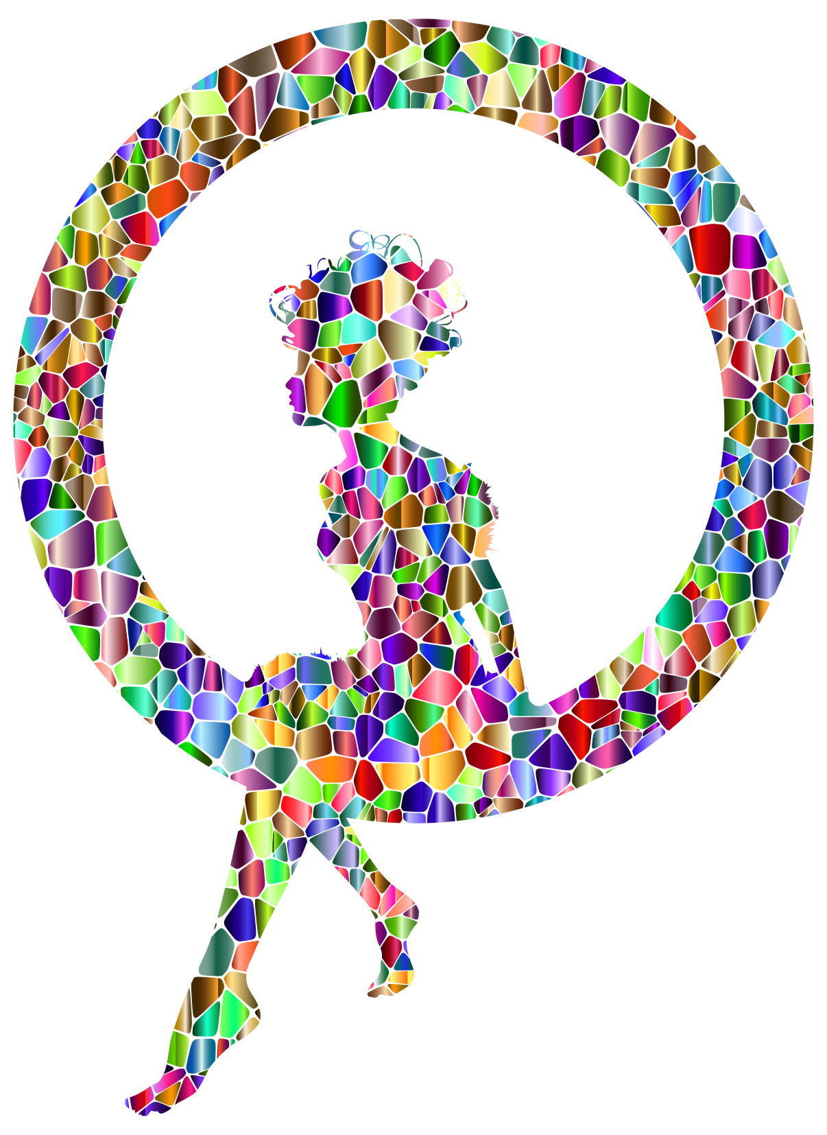 This features a colorful and artistic depiction of a woman standing on one leg. She is wearing a dress, which adds to the vibrant colors in the scene. The woman appears to be posing for a picture or participating in an activity that requires her to balance on one foot. The background consists of a large circle made up of various colored dots and shapes, creating a visually appealing contrast with the main subject. This unique combination of elements gives the image a dynamic and lively atmosphere. The woman's pose and the colorful background work together to create an eye-catching and memorable scene.