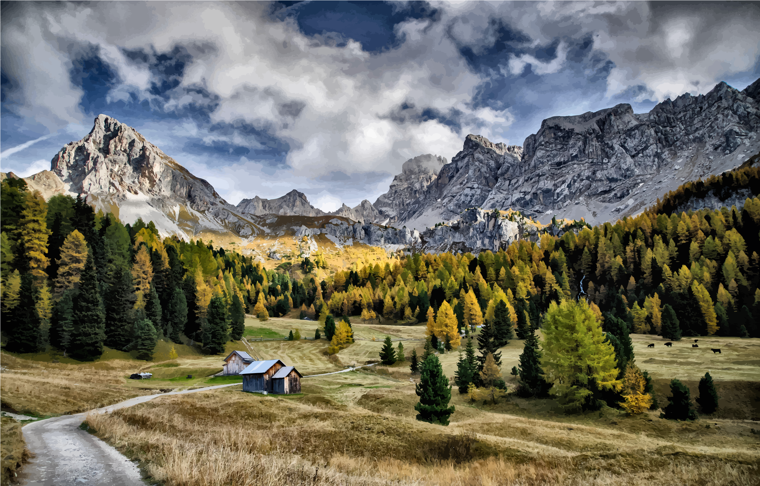 This features a picturesque mountainous landscape with a dirt road running through it. Along the road, there are several trees and bushes, creating a natural setting. A small cabin is situated near the center of the scene, adding to the charm of the area. In addition to the cabin, there are two other houses visible in the distance, further enhancing the rural atmosphere. The landscape also includes a lush green field, providing an open space for various activities or relaxation. Overall, this serene setting offers a peaceful escape from urban life and invites visitors to immerse themselves in nature.