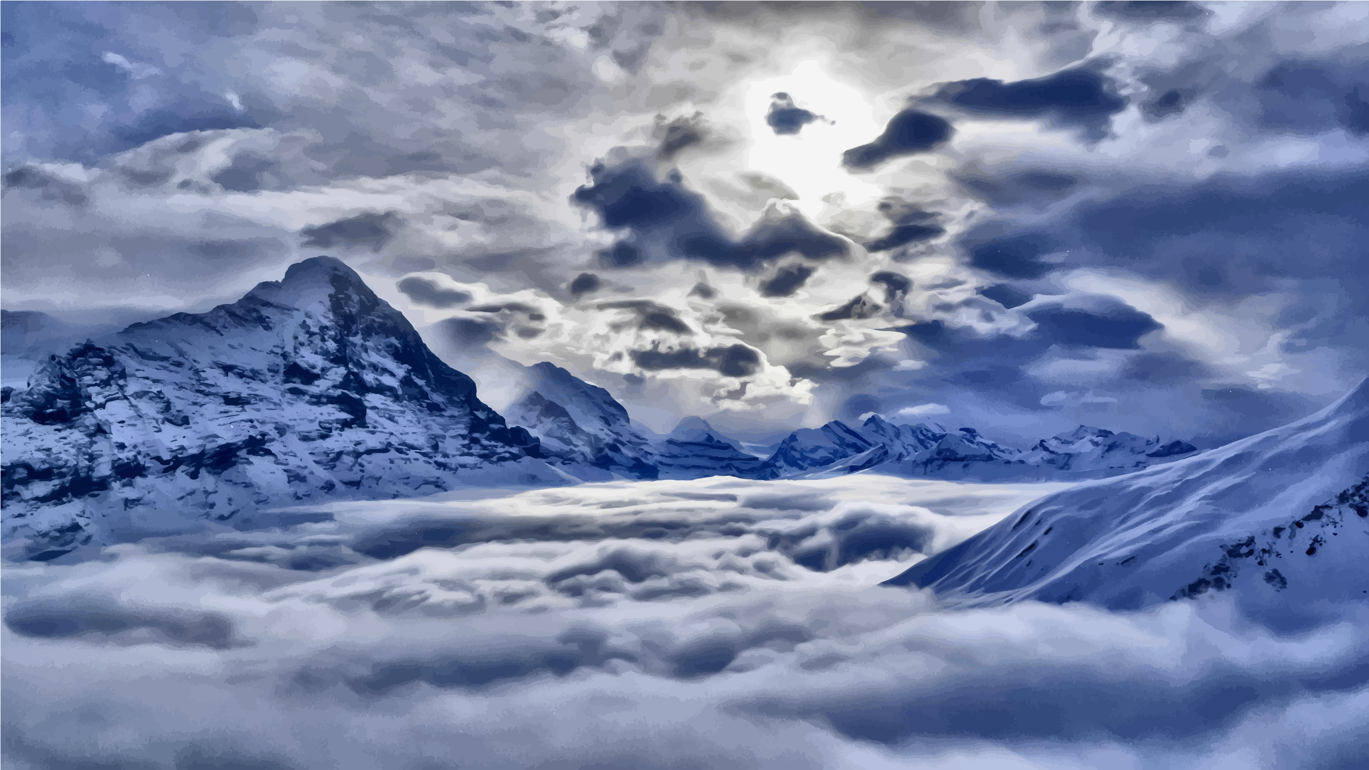 This features a breathtaking mountain range with snow-capped peaks and clouds surrounding them. The mountains are covered in fog, giving the scene an ethereal quality. The sky above the mountains is filled with clouds, creating a dramatic backdrop for the majestic landscape. The overall atmosphere of the photo evokes a sense of wonder and serenity as one gazes upon the natural beauty of these snow-capped peaks.