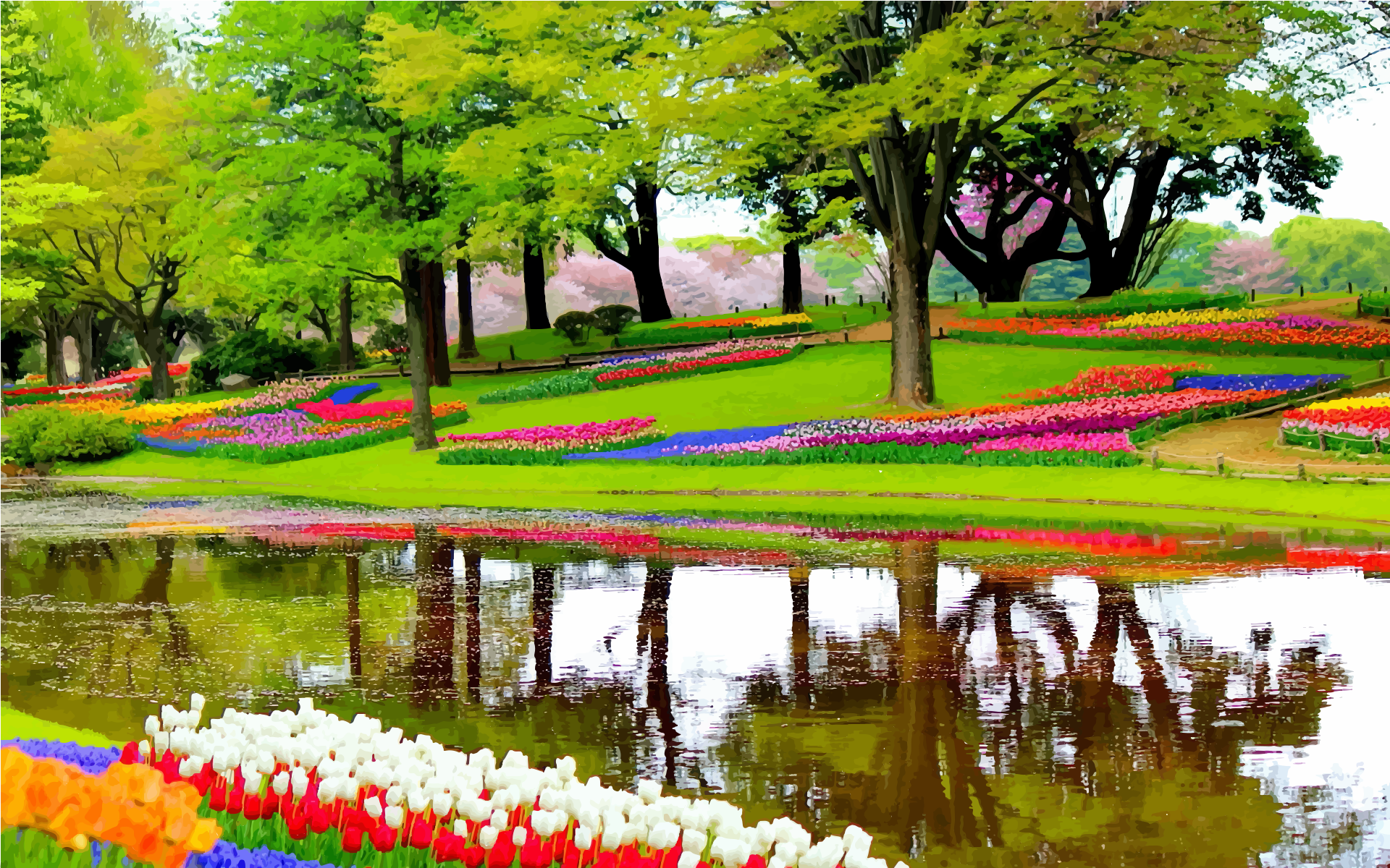 This features a beautiful garden with a pond in the middle, surrounded by trees and flowers. There are many different colored flowers scattered throughout the scene, creating a vibrant and lively atmosphere. A row of colorful tulips can be seen near the water's edge, adding to the overall beauty of the garden. The combination of the pond, trees, and flowers creates an idyllic setting for visitors to enjoy nature and take in the picturesque view.
