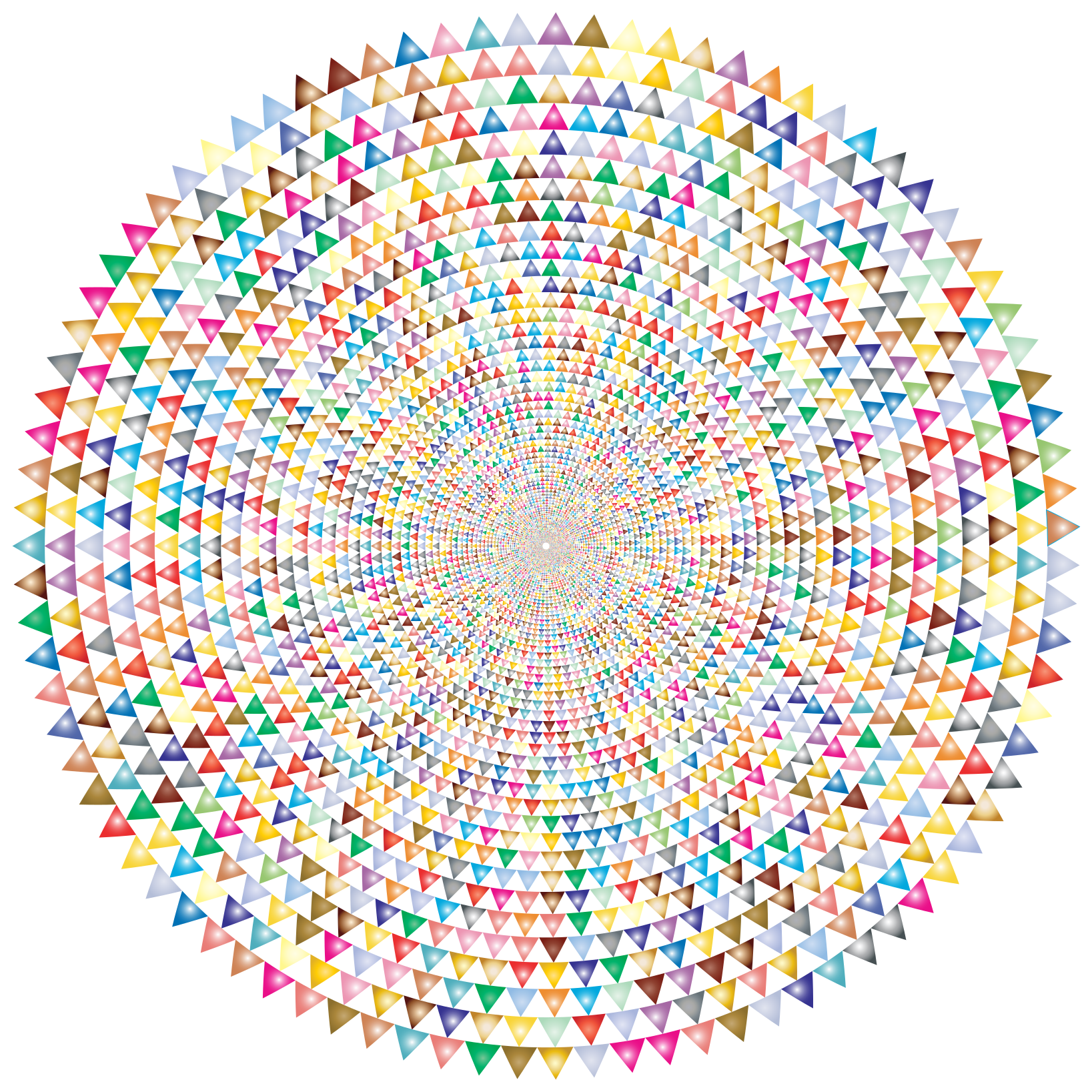 This features a large, colorful circle made up of many small triangles. These triangles are arranged in such a way that they create an intricate and visually appealing pattern. The colors of the triangles vary, adding depth and interest to the overall design. The circle is placed against a white background, which helps to emphasize the vibrant colors and shapes of the triangles. This artistic display could be used as a decorative piece or an eye-catching graphic element in various settings.