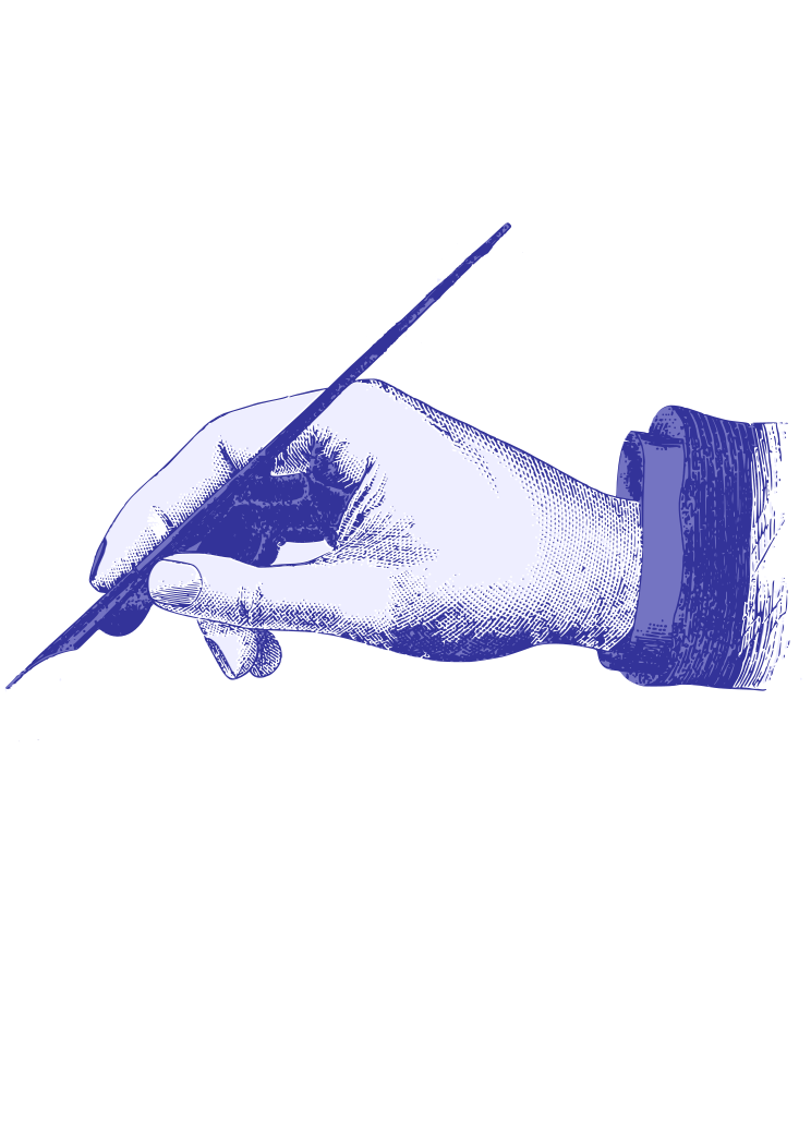This features a hand holding a pen, with the pen being in the middle of the scene. The hand is positioned towards the left side of the frame and appears to be writing or drawing something. The pen itself has a blue color, which contrasts nicely against the white background of the image. This artistic representation of a person using a pen creates an interesting visual effect that captures the viewer's attention.