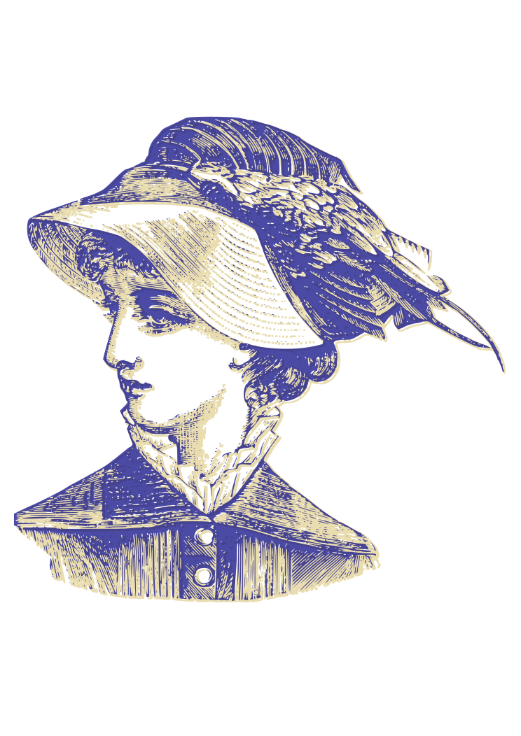 This features a woman wearing a fancy hat, which is adorned with a bird. She appears to be dressed in an old-fashioned style, possibly from the Victorian era. Her attire includes a coat and a tie, adding to her sophisticated appearance. The woman's face is visible, giving us a glimpse of her features as she looks off into the distance. This drawing captures the elegance and charm of the woman in her stylish outfit.