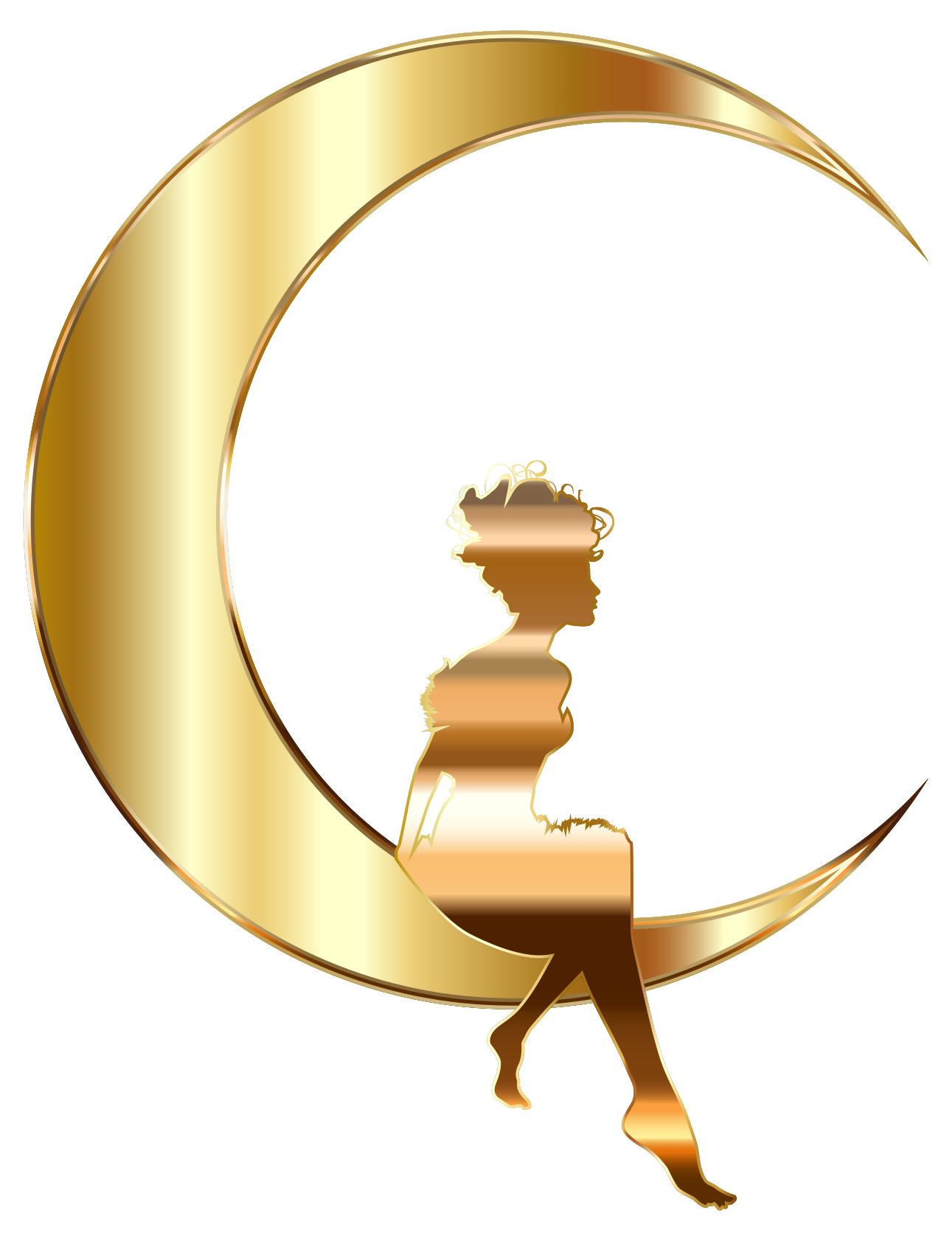This features a beautifully designed logo of a woman sitting on the crescent moon. She is depicted in a golden color, giving her an ethereal and magical appearance. The moon itself has a golden hue, adding to the overall charm of the design. This unique symbol could be used for various purposes such as branding or decorative elements, showcasing creativity and artistic flair.