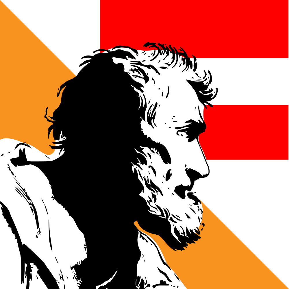 This features a man with a beard and mustache, wearing a toga. He appears to be looking off into the distance or possibly staring at something in the background. His facial hair is quite prominent, giving him an old-fashioned look. The man's head occupies most of the image, with his gaze directed towards the viewer.