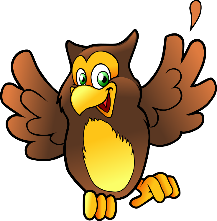 This features a colorful cartoon owl with a brown body and a gold colored stomach and face. It has its wings raised in the air, giving it an excited appearance. The owl's eyes are wide open, adding to its friendly demeanor. This whimsical illustration is likely meant to evoke feelings of warmth and happiness, as the owl seems to be inviting viewers with its cheerful expression.