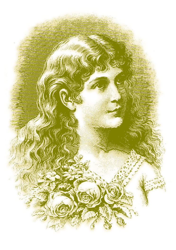 This is a vintage illustration of a beautiful girl with flowers. She has long hair and is wearing a dress, which features a floral pattern. The girl appears to be looking at the viewer, capturing their attention. In addition to her attire, she is adorned with several roses, adding an elegant touch to the illustration. The overall composition of the image creates a sense of nostalgia and charm, showcasing the beauty of the subject in a classic manner.