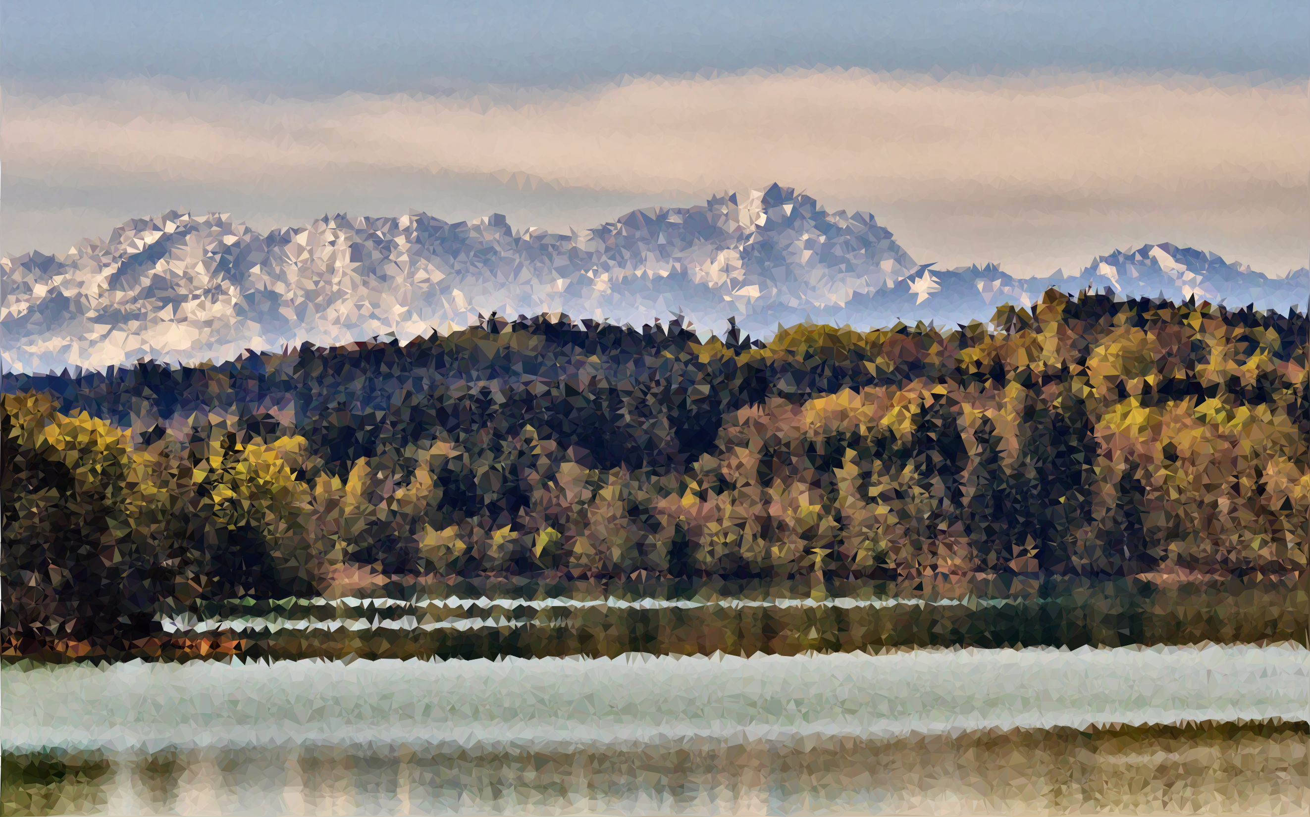 This features a serene lake surrounded by mountains, creating a picturesque landscape. The water is calm and reflects the beauty of the mountain range in the background. There are several trees scattered around the area, adding to the natural ambiance. In addition to the mountains, there are also some birds flying above the lake, further enhancing the tranquility of the scene. Overall, this image captures a peaceful moment in nature with stunning mountain views and the gentle presence of wildlife.