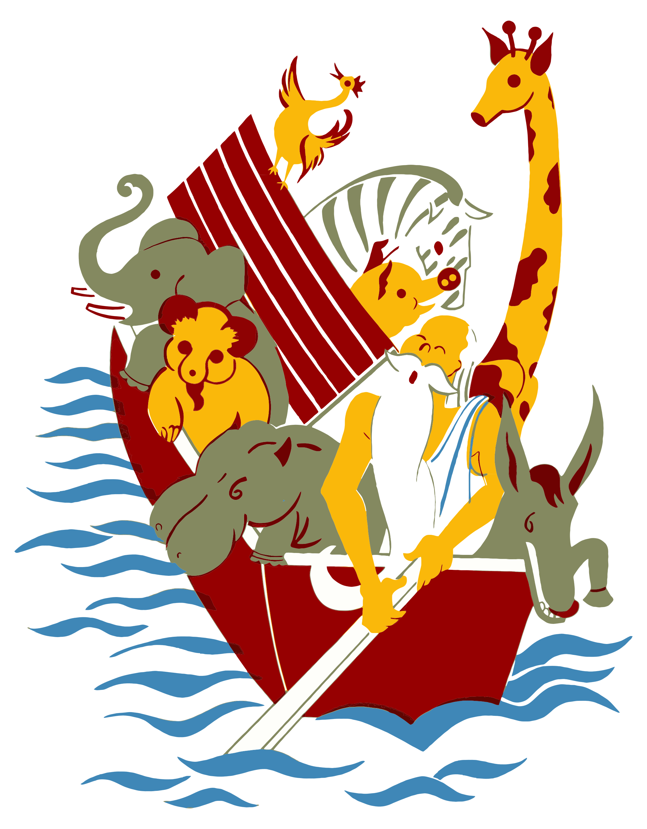 This features a colorful illustration of Noah's Ark, with various animals on board. Among the creatures are giraffes and elephants, as well as other exotic animals such as birds and monkeys. A man in a white robe is depicted rowing the boat, guiding it through the water. The scene captures the essence of Noah's Ark, showcasing its diverse inhabitants and the man responsible for their journey.