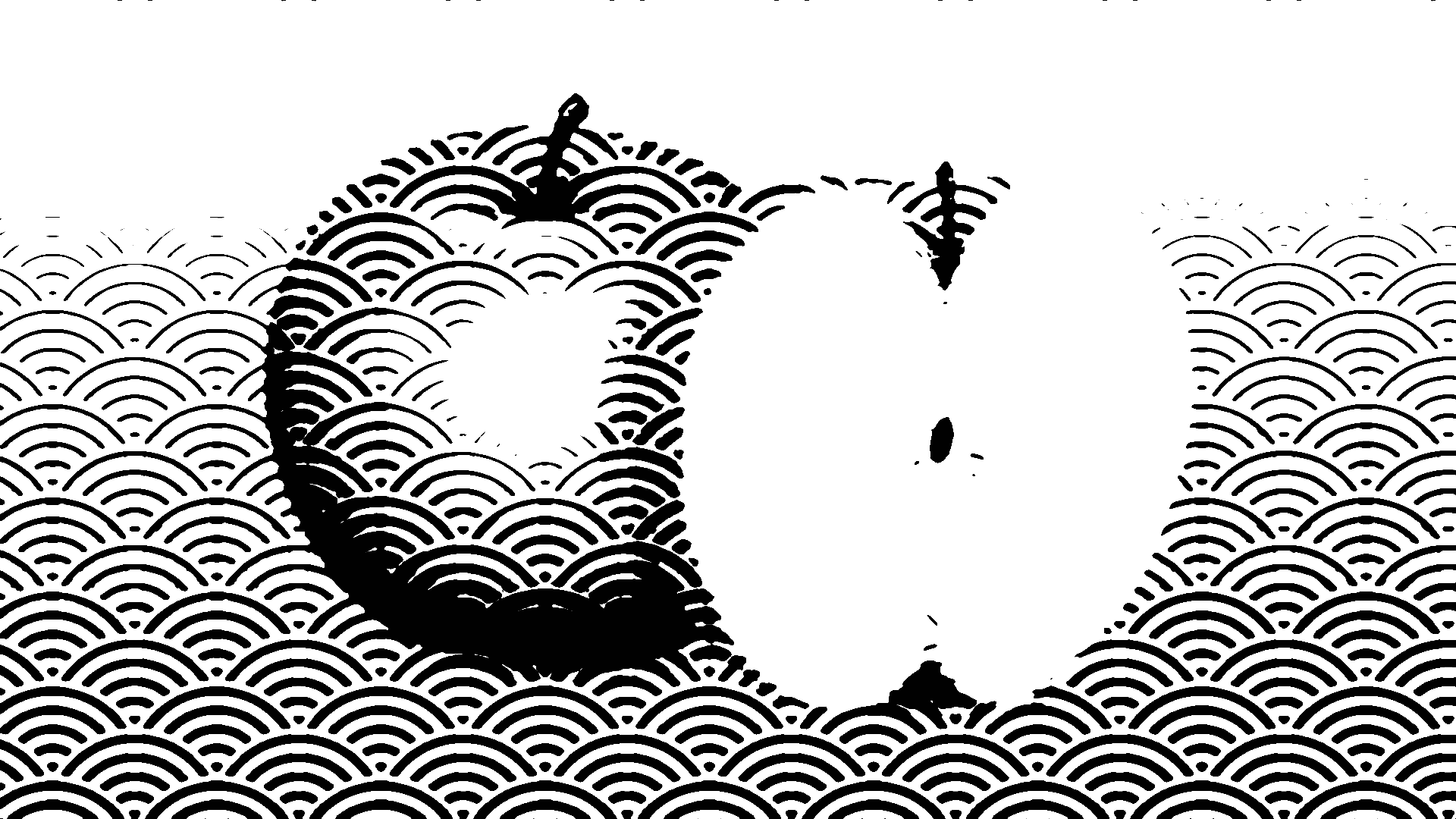 This features a black and white design of an apple with the letter "o" on it. The apple is placed in front of a wave-like pattern, giving the impression that it's floating on water. There are two apples in total, one larger and one smaller, both positioned close to each other. The overall composition creates a visually appealing contrast between the apple and its surroundings.