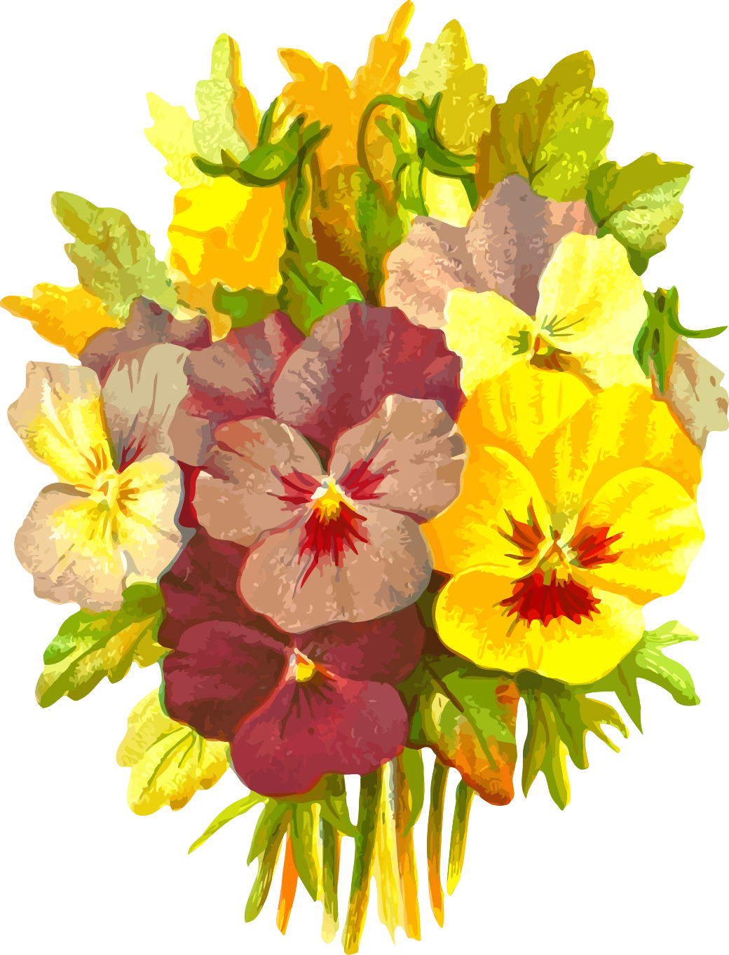 This features a beautiful bouquet of colorful flowers, including yellow and red pansies. These flowers are arranged in an artistic manner, with some of them being placed on top of each other. The bouquet is held together by green leaves that surround the flowers, adding to their visual appeal. The combination of vibrant colors and intricate details makes this illustration a delightful representation of nature's beauty.
