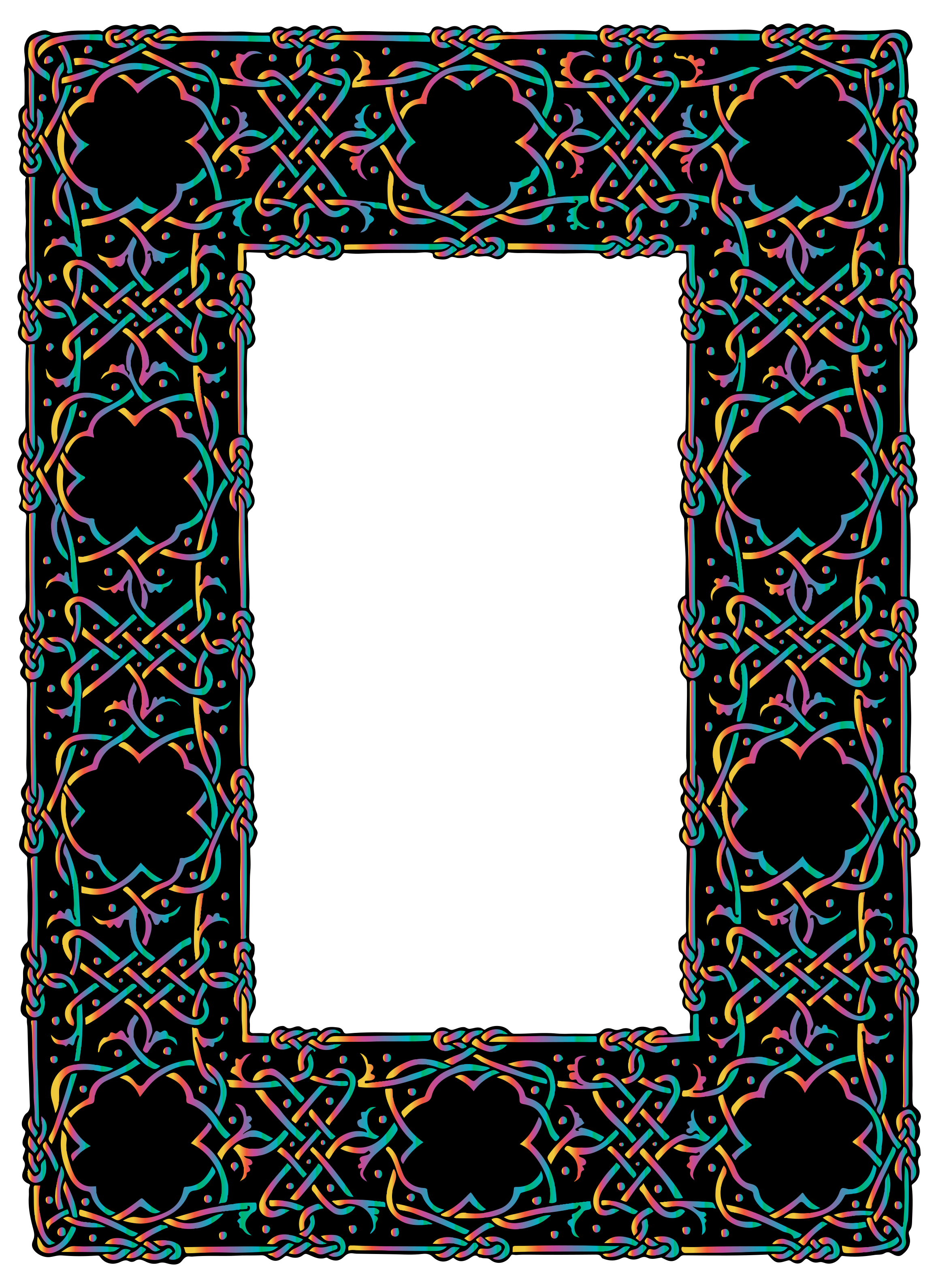 This features a black and white picture of an ornate frame with a white square in the center. This square is surrounded by intricate designs, giving it a unique and artistic appearance. The frame itself has a colorful pattern that adds to its visual appeal. Overall, this image showcases a beautifully crafted piece of artwork that captures attention due to its striking design elements.
