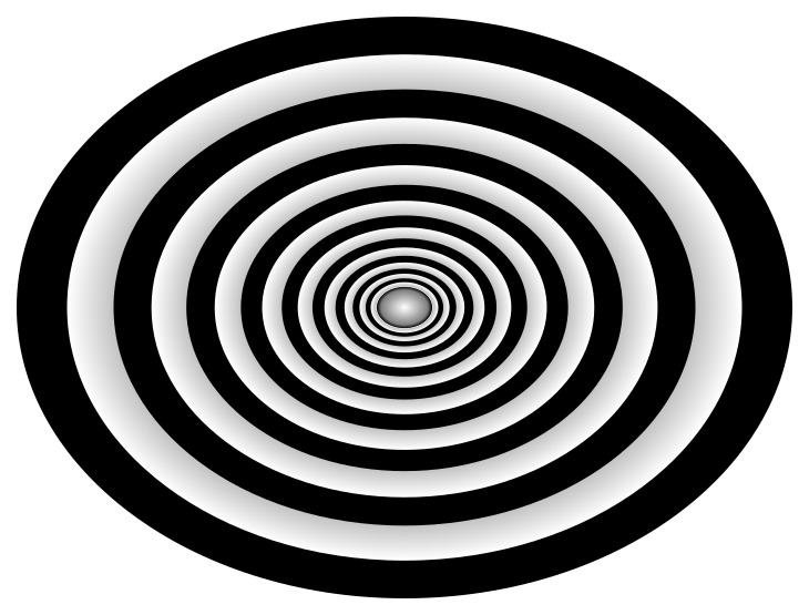 This features a black and white circular pattern that resembles an optical illusion. It consists of multiple concentric circles, each slightly overlapping the other, creating a visually intriguing effect. The circles are arranged in such a way that they appear to be moving towards the center, giving the impression of depth and motion within the image. This pattern is reminiscent of the retro, perspective-based artwork inspired by the 1960's TV series "The Time Tunnel."
