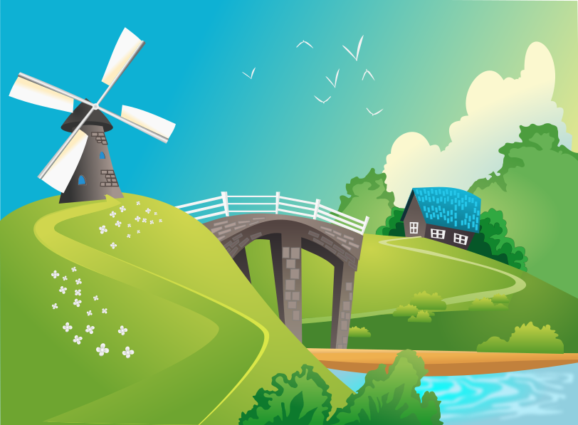 This features a picturesque landscape with a windmill situated on top of a hill. A bridge can be seen crossing over the water, and there is a small house nearby. In addition to these elements, several birds are scattered throughout the scene, adding life and movement to the picture. Overall, it's a serene and inviting image that captures the beauty of nature.