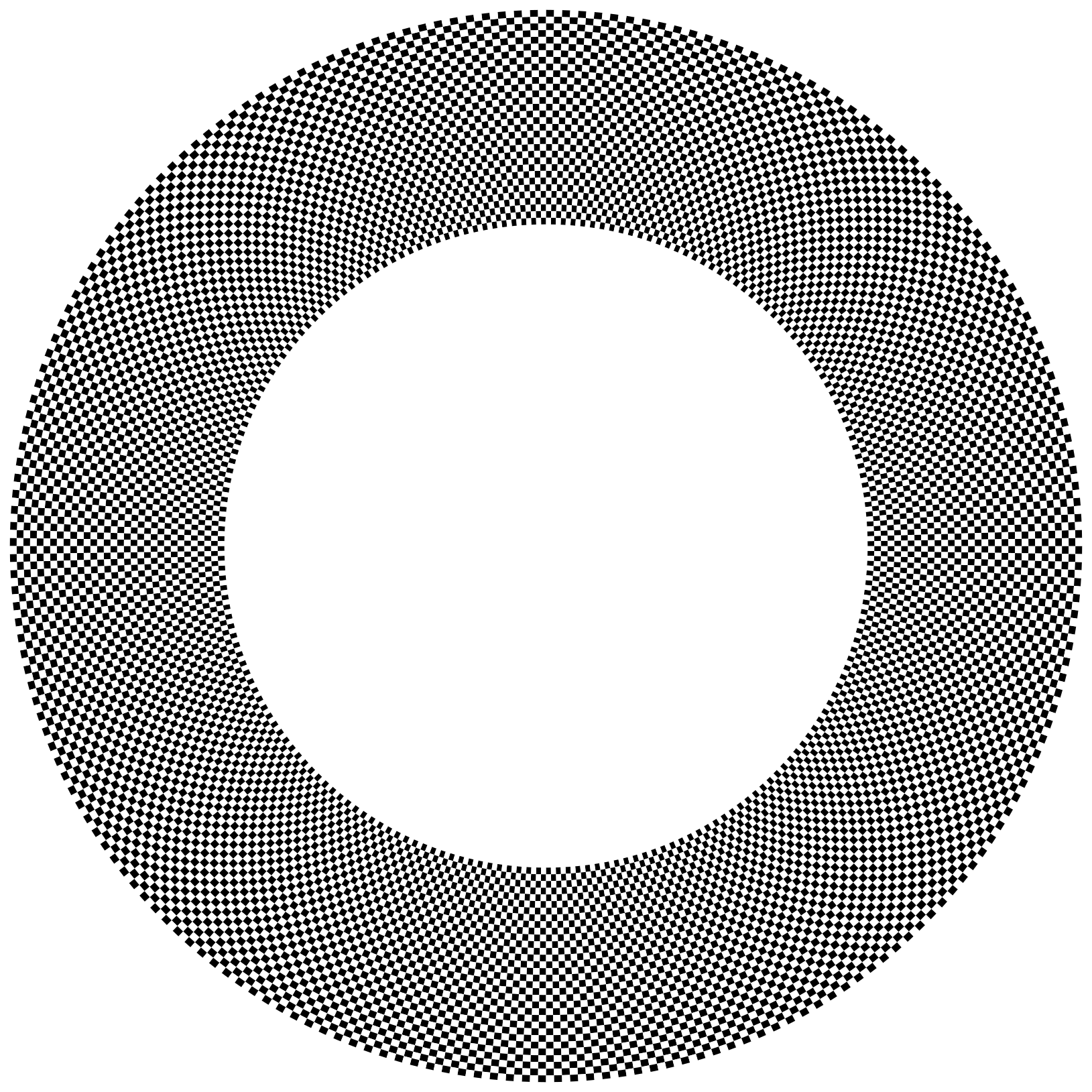 This features a large, round circle with a black and white design. It is made up of many small squares that are arranged in a circular pattern around the center of the circle. These squares are all black in color, creating a striking contrast against the white background. The overall effect is an intricate and visually appealing pattern that draws attention to the central circle.