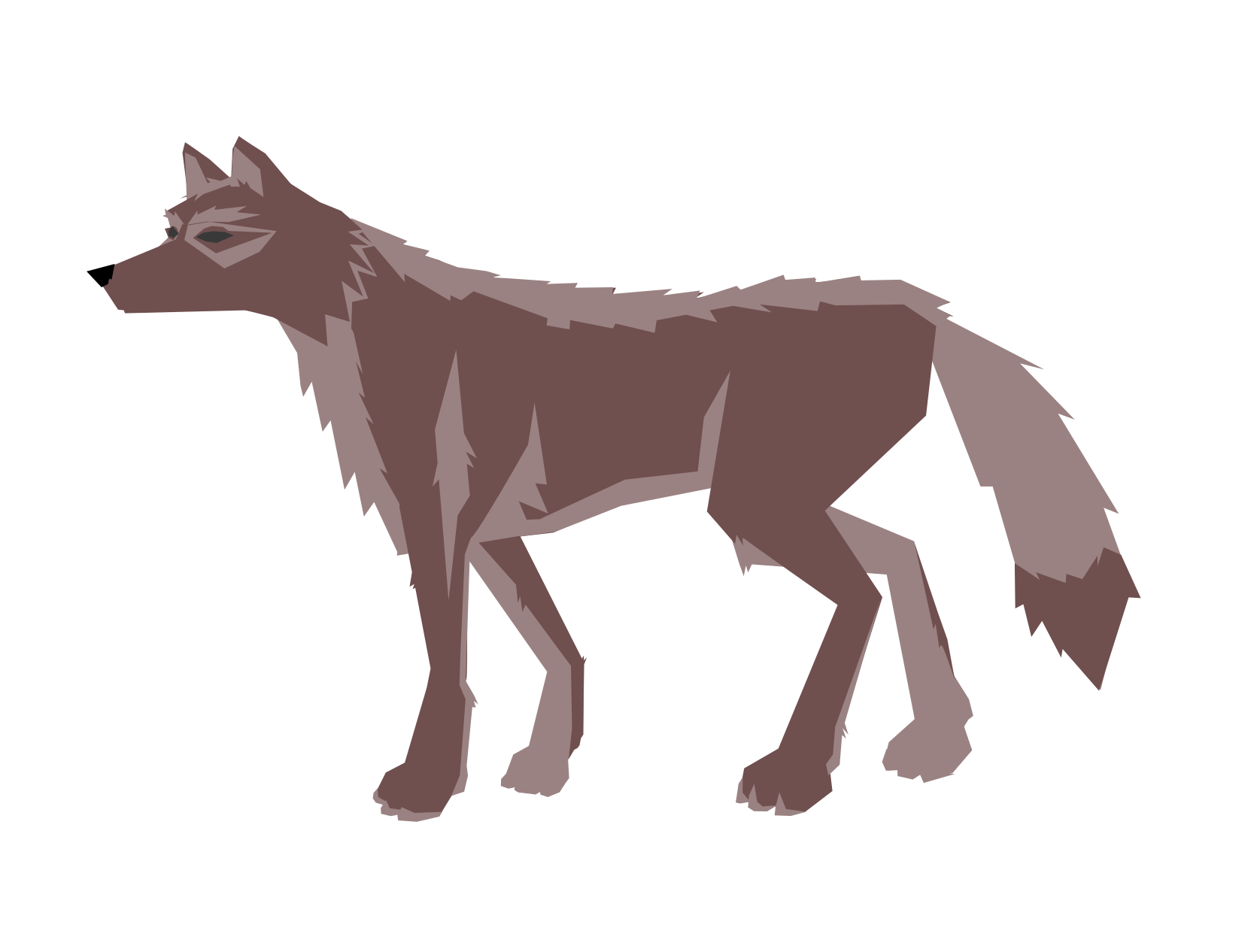 This features a gray and brown wolf with its head turned to the left. It appears to be walking or running, as it is captured in motion. The wolf's fur has different shades of brown, giving it a unique appearance. Its body is positioned towards the right side of the image, while its head occupies a significant portion of the frame on the left side. This drawing showcases the wolf's distinctive features and movement in an artistic manner.