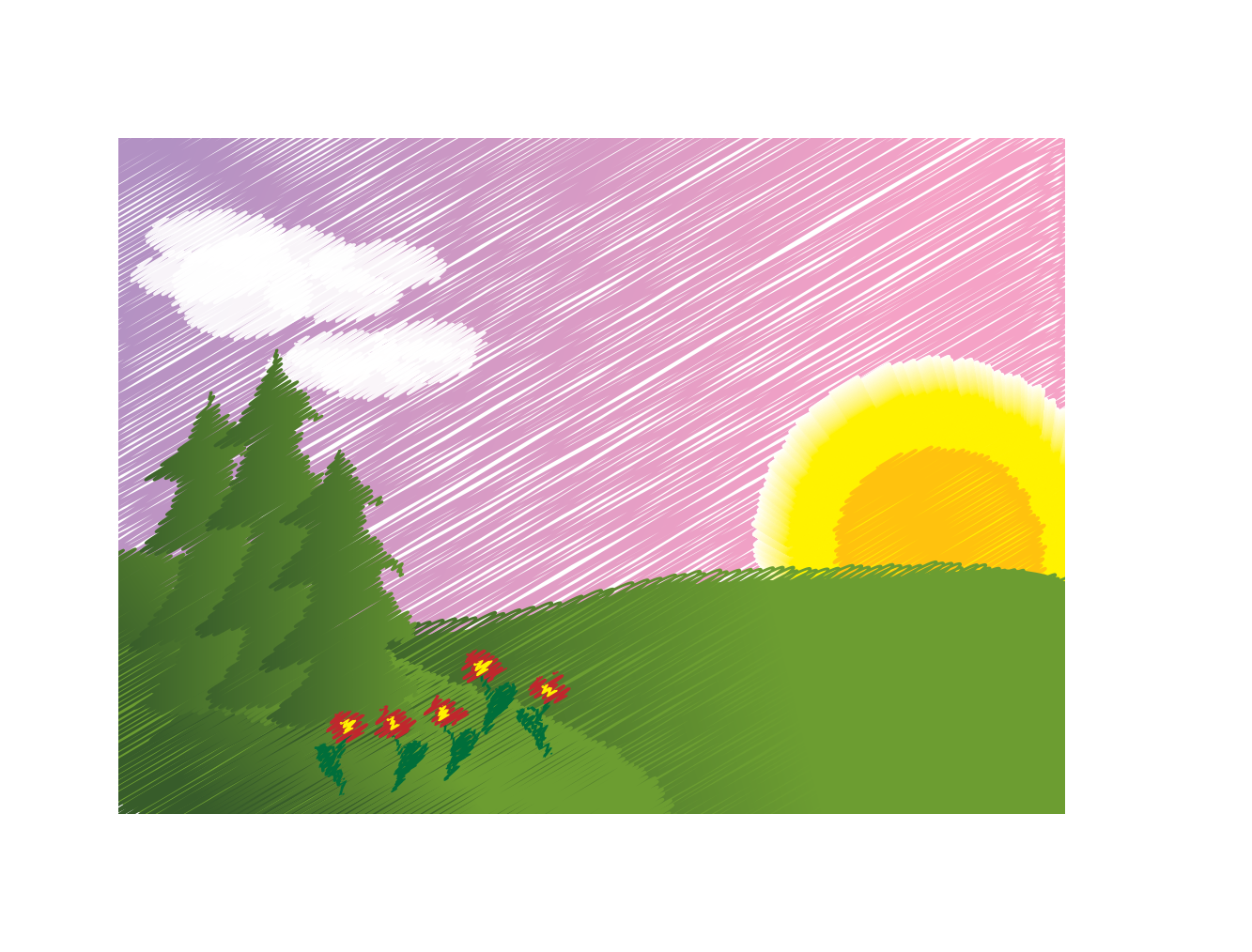 This features a beautiful scene of a sunset with the sky painted in pink hues. There are two clouds visible in the sky, one on the left side and another towards the center. A group of five flowers can be seen next to each other, adding a touch of color to the serene landscape. In the foreground, there is a field with several pine trees scattered throughout, creating a picturesque backdrop for this captivating sunset scene.