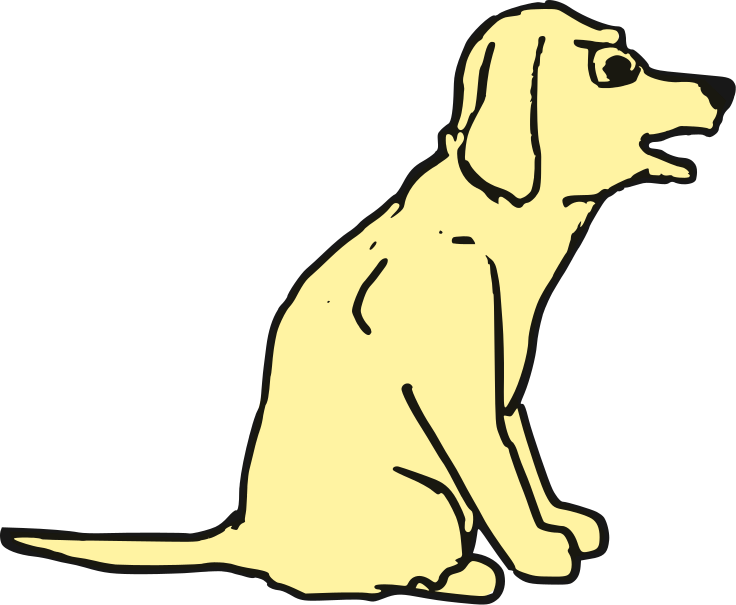 This features a yellow dog sitting down on the ground. It appears to be an angry or displeased expression, as it is staring off into the distance with its mouth open. The dog's posture suggests that it might be waiting for something or someone, possibly displaying a sense of anticipation or impatience. Its positioning in the scene indicates that it is the main focus of the image, drawing attention to its unique appearance and demeanor.