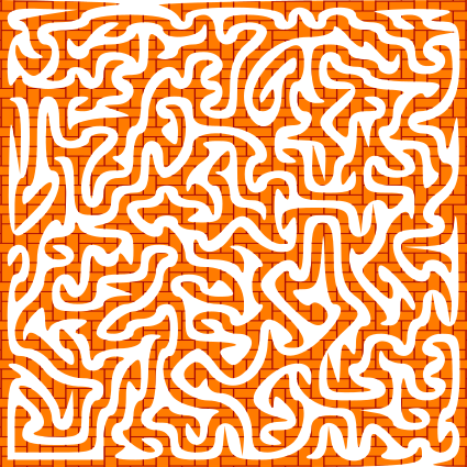 This features a complex and intricate maze design, with the walls made of brick-like shapes. The maze is filled with an orange color that contrasts well with the white lines that outline the various paths within the maze. The overall appearance gives off a sense of depth and complexity, making it an interesting visual piece.