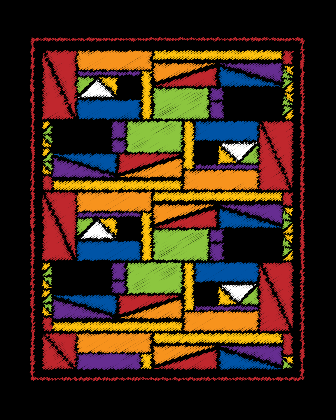 This features a colorful and intricate quilt made up of various shapes, including squares, triangles, and rectangles. These geometric patterns are arranged in a visually appealing manner, creating an artistic display. The quilt is composed of different colors, such as red, blue, green, yellow, and orange, which contribute to its vibrant appearance. The combination of these shapes and the various colors make it an interesting piece of modern art that stands out against a black background.