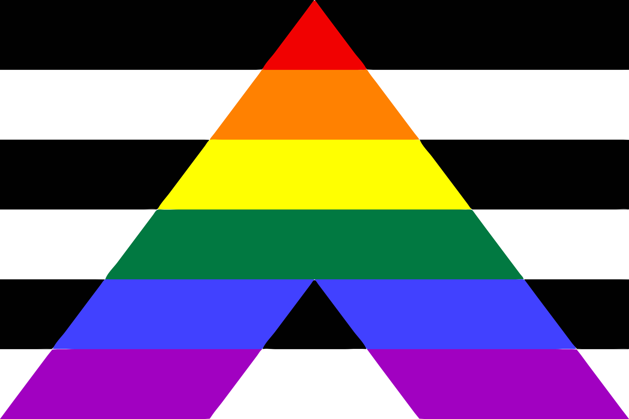 This features a colorful triangle with rainbow colors, including red, blue, and green. This triangle is placed in front of a black and white striped background, creating an eye-catching contrast between the two elements. The triangle's vibrant colors make it stand out against the monochromatic backdrop, drawing attention to its unique design.
