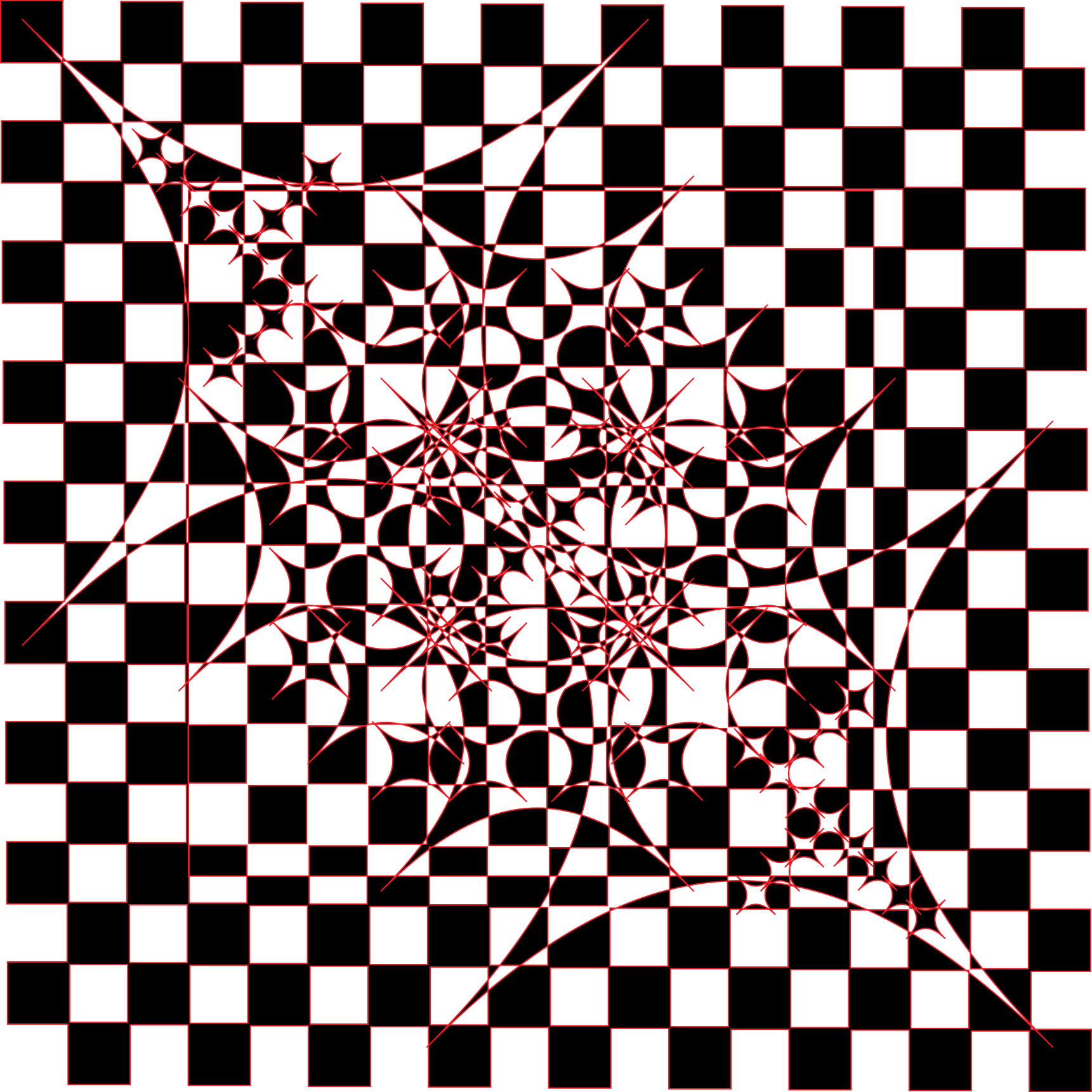 This is a black and white checkered pattern with red designs in the center. These designs are interconnected, creating an intricate and visually appealing piece of artwork. The patterns are arranged in such a way that they create a sense of depth and complexity, making it an interesting visual experience for anyone who looks at it. The combination of black and white checkers with red designs creates a striking contrast, drawing the viewer's attention to the centerpiece of the image.