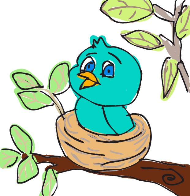 This features a colorful cartoon bird sitting in an egg-shaped nest. The bird is blue and yellow, with its beak open as if it's singing or talking. It appears to be perched on a branch, surrounded by leaves that are green and white. The scene has a whimsical and playful atmosphere, making it an appealing image for children or anyone who enjoys cartoon characters.
