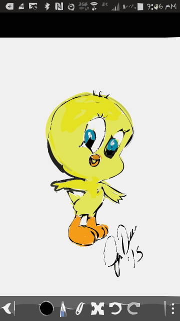 This features a yellow bird with blue eyes, standing on one foot and looking to the side. It appears to be an animated cartoon character, possibly from a children's show or game. The bird is positioned in the center of the frame, taking up most of the space. The background consists of a white surface that provides a clean backdrop for the bird's vibrant colors.