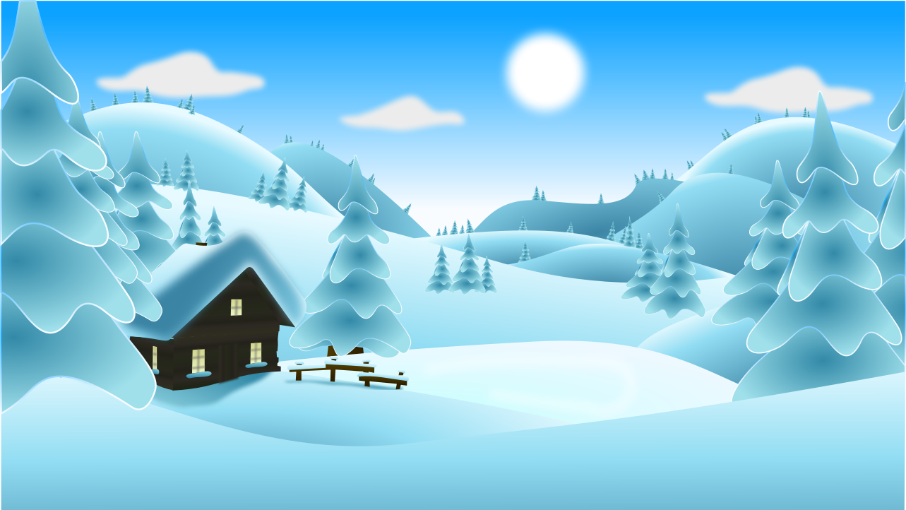 This depicts a snowy winter landscape with a cozy cabin nestled in the middle of it. The cabin is surrounded by trees and hills, all covered in a layer of white snow. A bench can be seen near the cabin, providing a place to sit and enjoy the serene surroundings. In addition to the cabin, there are several other houses scattered throughout the scene, adding to the picturesque winter atmosphere. The overall setting is reminiscent of a Christmas card or holiday greeting, with the snow-covered landscape creating a sense of warmth and tranquility.