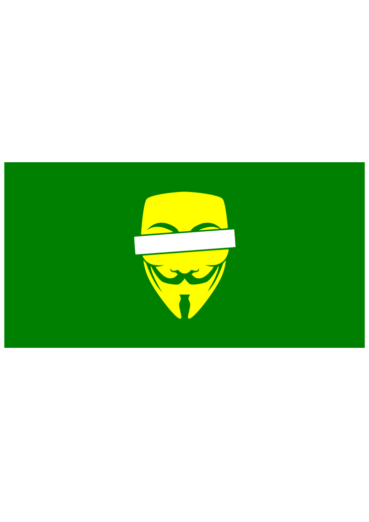 This features a green and yellow flag with an Anonymous logo on it. The flag is prominently displayed in the center of the picture, taking up most of the space. The Anonymous symbol consists of a white mask overlapping a black mask, creating a striking visual effect. This flag represents the group's commitment to privacy and freedom of expression.