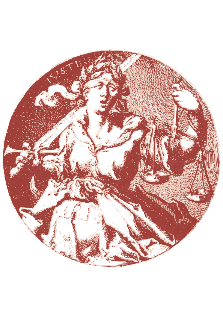 This features a woman dressed in a gown, holding scales of justice and a sword. She is standing on top of a red circle with her mouth open, possibly making an exclamation or shouting. The woman appears to be the personification of Justice, symbolizing fairness and impartiality. The scene is depicted in black and white, giving it a classic and timeless feel.