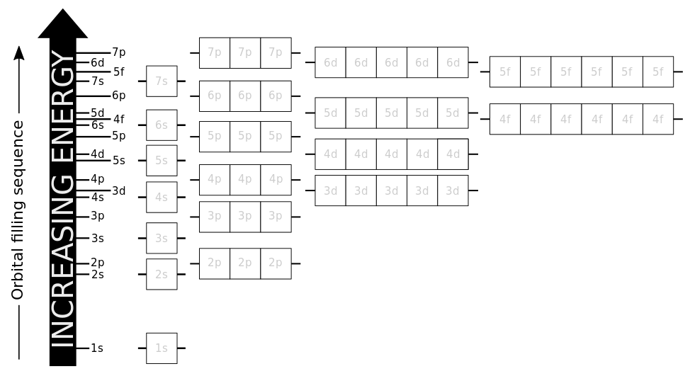 This displays a chart of electrons in various configurations. It is a black and white diagram that shows the different arrangements of electrons, with each configuration labeled for easy identification. The chart appears to be a visual representation of energy levels or electron orbitals, providing an overview of how electrons are distributed within these structures. This type of diagram can be useful in understanding the behavior of electrons in chemical reactions and other scientific applications.