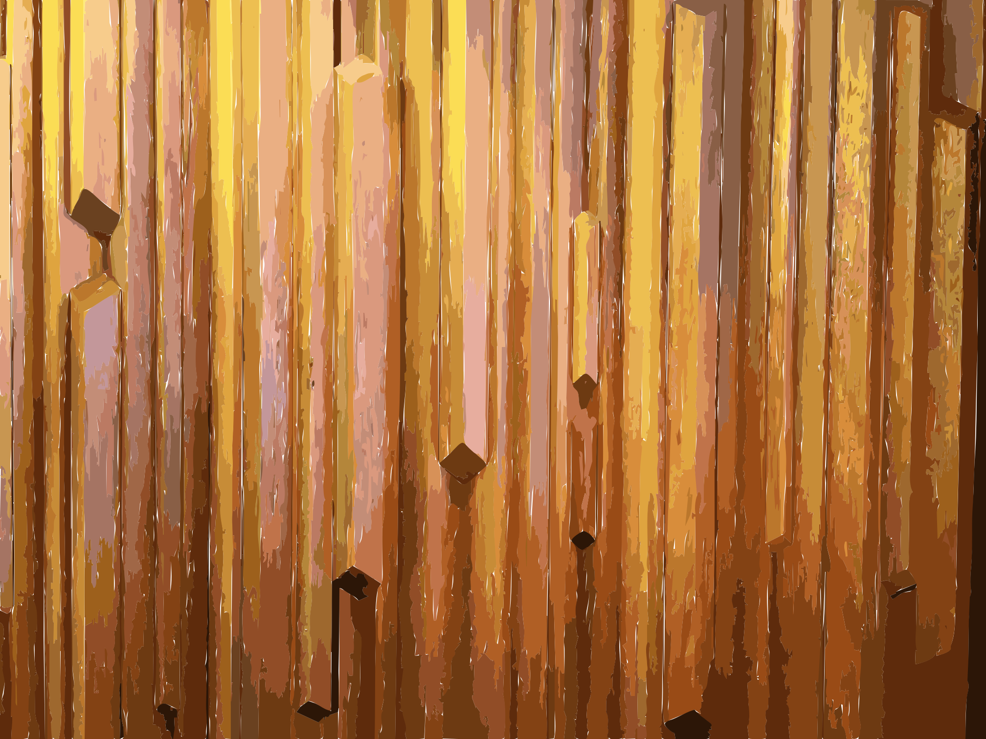 This features a wall made of wooden planks, giving it an old and rustic appearance. The wooden planks are arranged in various orientations, creating a visually interesting pattern on the wall. Some of the wooden planks have a yellowish hue, while others appear to be more brown or golden in color. This combination of colors adds depth and warmth to the scene, making it an appealing backdrop for any setting. The arrangement of the wooden planks creates a sense of texture and dimension, giving the wall a unique and eye-catching appearance.