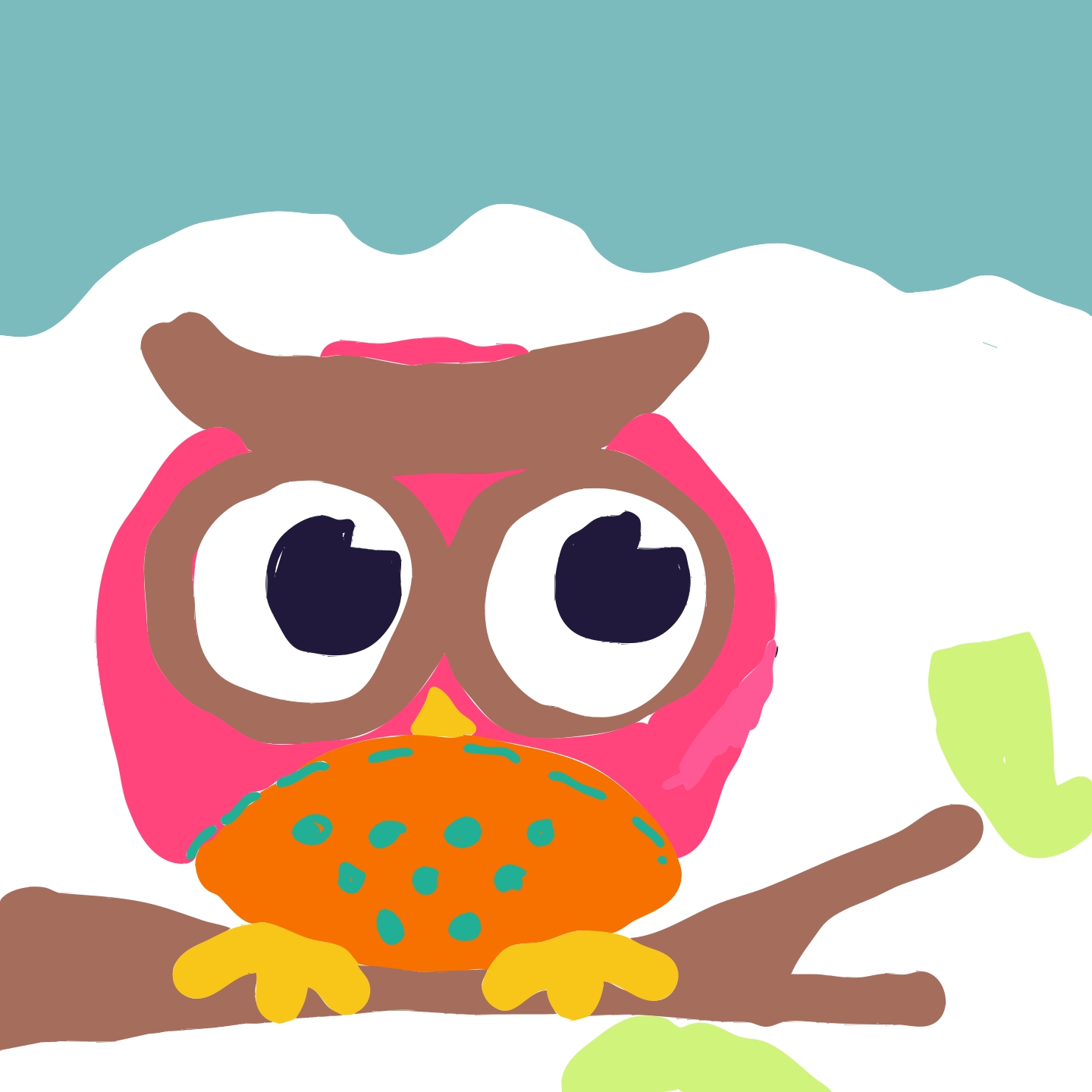 This features a colorful cartoon owl sitting on top of a leaf. The owl is the main focus of the scene, and it appears to be looking at something off-camera. The owl's eyes are open wide, giving it an expressive look. The background consists of a white surface with some greenery visible in the lower right corner. Overall, this image captures a playful and whimsical moment featuring a cute cartoon owl.