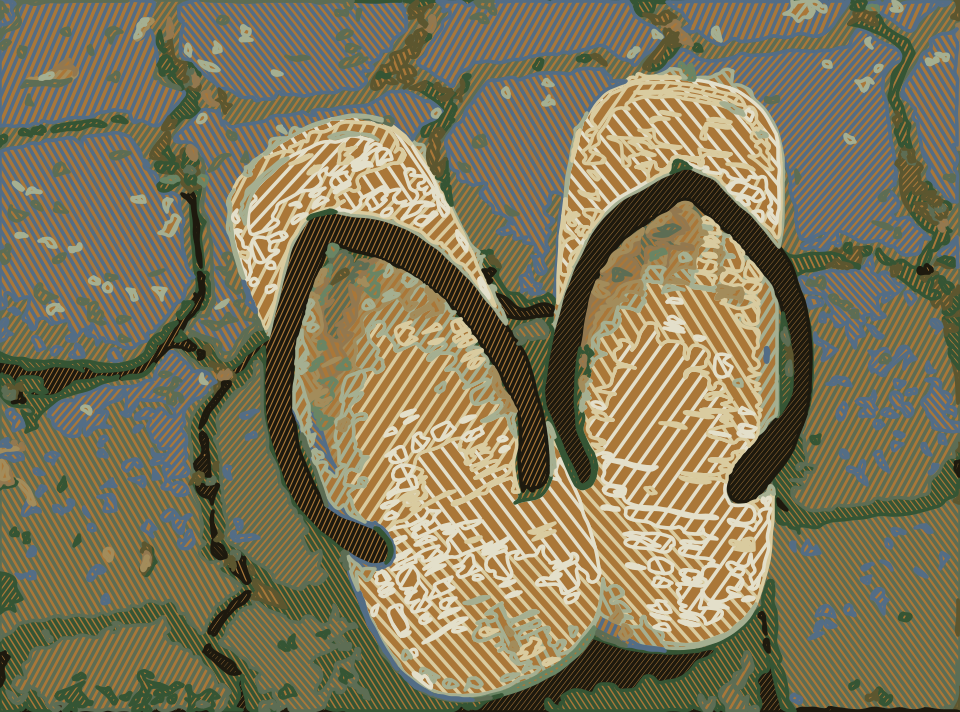 This features a pair of light tan flip flops with brown straps, placed on the ground. They are positioned in such a way that they appear to be resting or sitting on top of each other. The flip flops have a worn and weathered appearance, giving them an aged look. This artistic representation of flip flops is likely meant to evoke a sense of nostalgia or perhaps convey the idea of relaxation and leisure time spent outdoors.