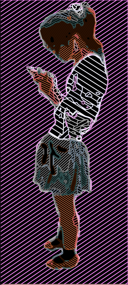 This features a young girl standing in front of a pink background, holding a cell phone. She appears to be looking at her phone and possibly texting or browsing the internet. The scene is depicted in an abstract manner with a red and black color scheme, giving it a unique and artistic appearance. This image is part of a series called "Life in Japan," which showcases the artist's creative expression through various abstract images of standing young ladies.