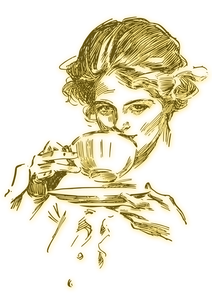 This features a woman in an old-fashioned drawing, holding a cup of tea. She is wearing a dress and appears to be enjoying her drink. The cup she holds is placed on a saucer, which is positioned on a dining table. The scene captures the essence of a classic tea time moment with a touch of elegance.