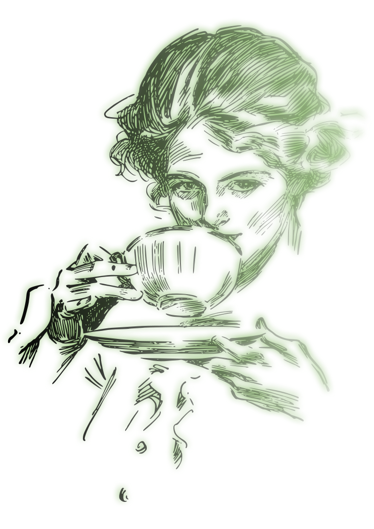 This features a woman in an old-fashioned drawing, holding a cup of tea. She is wearing a white dress and appears to be enjoying her drink. The cup she holds is placed on a saucer, which is positioned on top of a dining table. The scene captures the essence of a classic tea time moment with a touch of nostalgia.