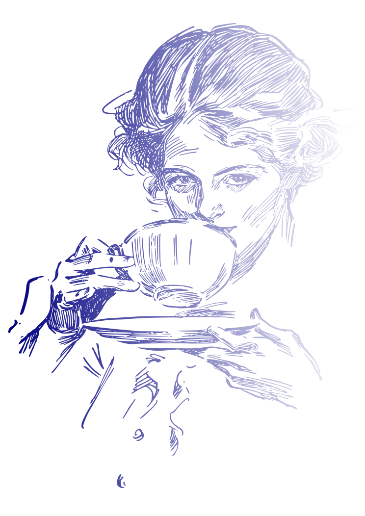 This features a woman in a blue dress, holding a cup of tea. She is wearing a pearl necklace and appears to be enjoying her drink. The drawing captures the essence of the scene with a sense of depth and dimension. The woman's reflection can be seen on the cup, adding an interesting visual element to the artwork. Overall, it is a beautifully drawn portrait that showcases the subject's elegance and appreciation for tea.
