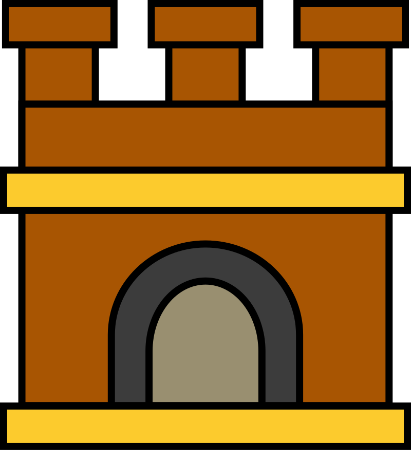 This features a brown brick building with an arched doorway. The door is the main focus of the scene, and it appears to be made from wood. The surrounding area has a yellowish hue, which adds warmth to the overall appearance of the structure. The building's design suggests that it could be part of a castle or another historical building with architectural significance.