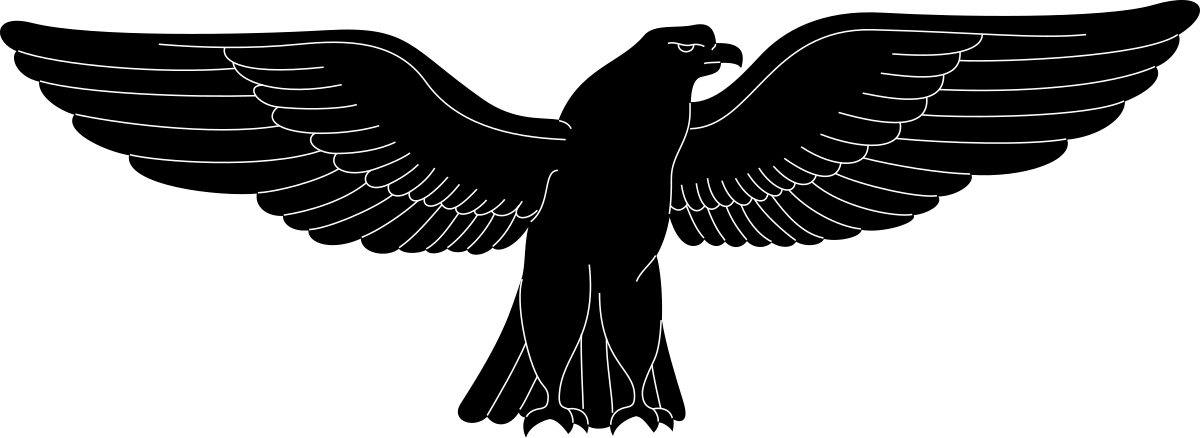 This features a large black bird with wings spread wide, soaring through the sky. It appears to be an eagle or a similar type of bird of prey. The bird is positioned in the upper left corner of the image and fills most of the frame. The background consists of a pale color that contrasts with the dark silhouette of the bird, creating a striking visual effect.